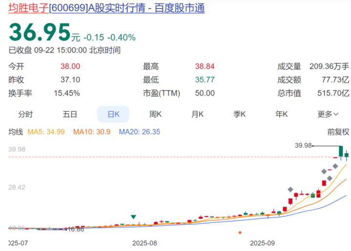 市场方面,均胜电子今日收报36.95元,下跌0.4%,最新市值515亿元。