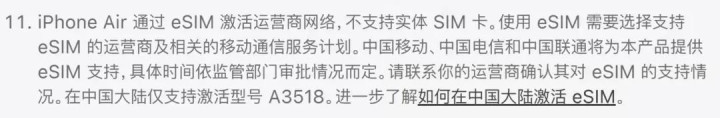 苹果官网现已显示,iPhoneAir通过eSIM激活运营商网络,不支持实体SIM卡。使用eSIM需要选择支持eSIM的运营商及相关的移动通信服务计划。中国移动、中国电信和中国联通将为本产品提供eSIM支持,具体时间依监管部门审批情况而定。请联系运营商确认其对eSIM的支持情况。